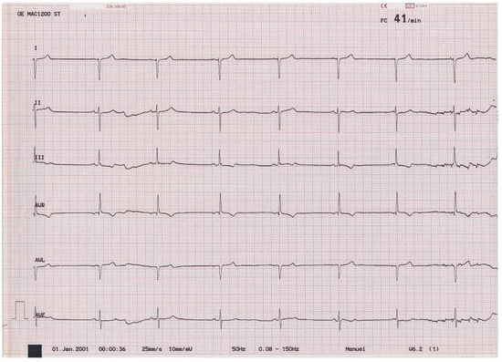 The 12-lead ECG (Figure 1 and Figure 2) shows bradycardia at 40–45 bpm with sinus rhythm alternating with junctional rhythm. There is right axis deviation with QRS axis at 170°. The PR interval is normal in sinus rhythm, and QRS is narrow. Precordial leads demonstrate right ventricular (RV) hypertrophy and there is no Q wave with a small R wave and deep S wave in lead V6.