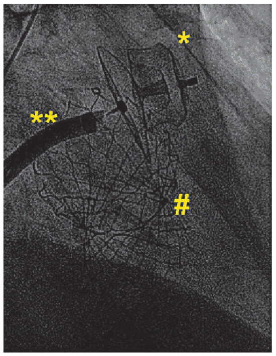 The following day, a transthoracic echocardiography confirmed a well-functioning CoreValve prosthesis with only trivial paravalvular regurgitation and a mean transvalvular gradient of 5 mm Hg as well as the correct position of the Amplatzer Amulet 28-mm Occluder.
