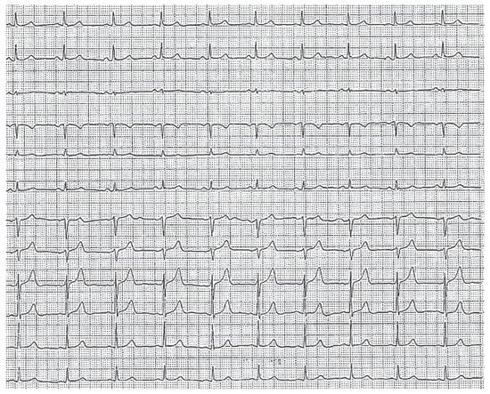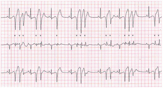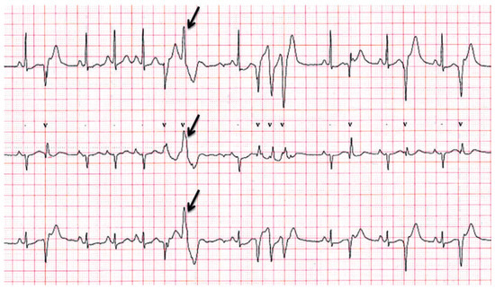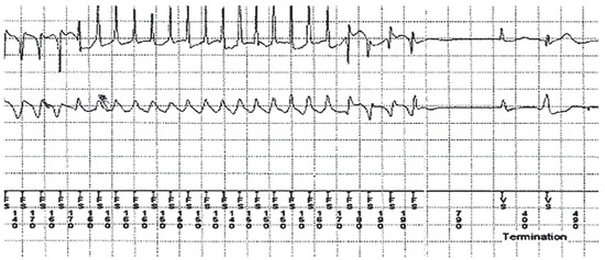 - Richter, S.; Gebauer, R.; Hindricks, G.; Brugada, P. A classic electrocardiographic manifestation of catecholaminergic polymorphic ventricular tachycardia. J Cardiovasc Electrophysiol. 2012, 23, 560. [Google Scholar] [CrossRef] [PubMed]