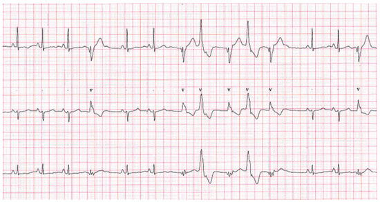 Three-derivation Holter recording. Short-coupled single ventricular premature beats, doublets and triplets interspaced with sinus beats during daily activity. V: ventricular beats.
