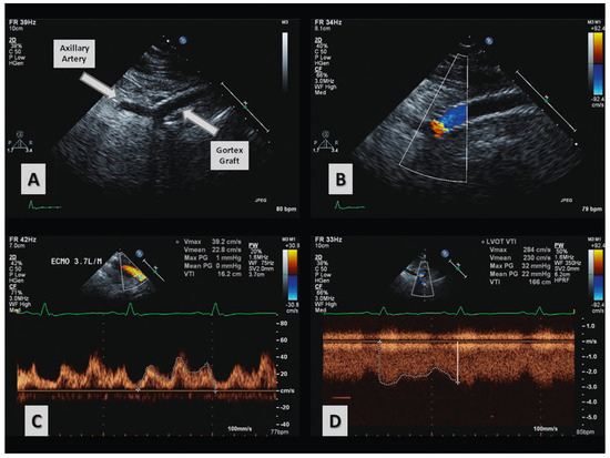 4. Chamogeorgakis, T.; Lima, B.; Shafii, A.E.; Nagpal, D.; Pokersnik, J.A.; Navia, J.L.; et al. Outcomes of axillary artery side graft cannulation for extracorporeal membrane oxygenation. J Thorac Cardiovasc Surg. 2013, 145, 1088–1092. [Google Scholar] [CrossRef] [PubMed]
