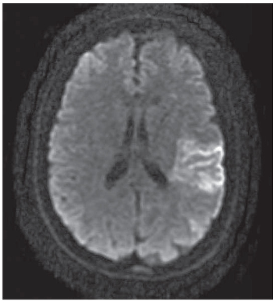 MR scan showing an extensive diffusion-weighted MR (DWI) hyperintense lesion in one-third to one-half of the MCA territory.