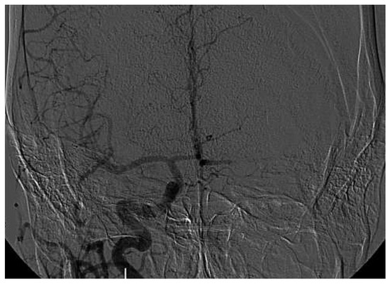 Injection into the right carotid artery, showing both anterior cerebral arteries. The left anterior cerebral artery is perfused over the anterior communicating artery of the circle of Willis.
