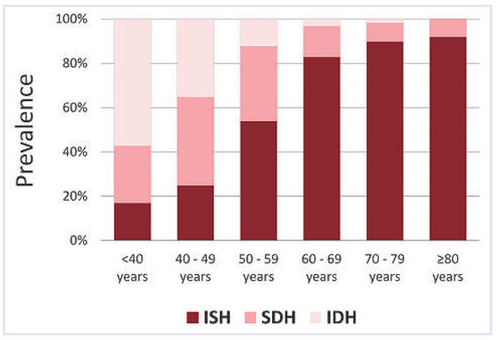 Prevalence of isolated systolic hypertension (ISH) according to age (data from reference [7]). SDH = combined systolic-diastolic hypertension; IDH = isolated diastolic hypertension.
