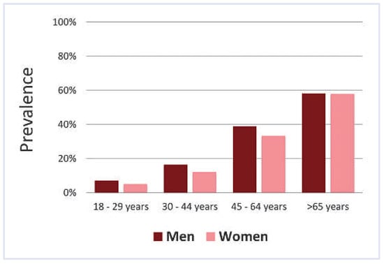 Prevalence of arterial hypertension according to age and sex (data from reference [8]).