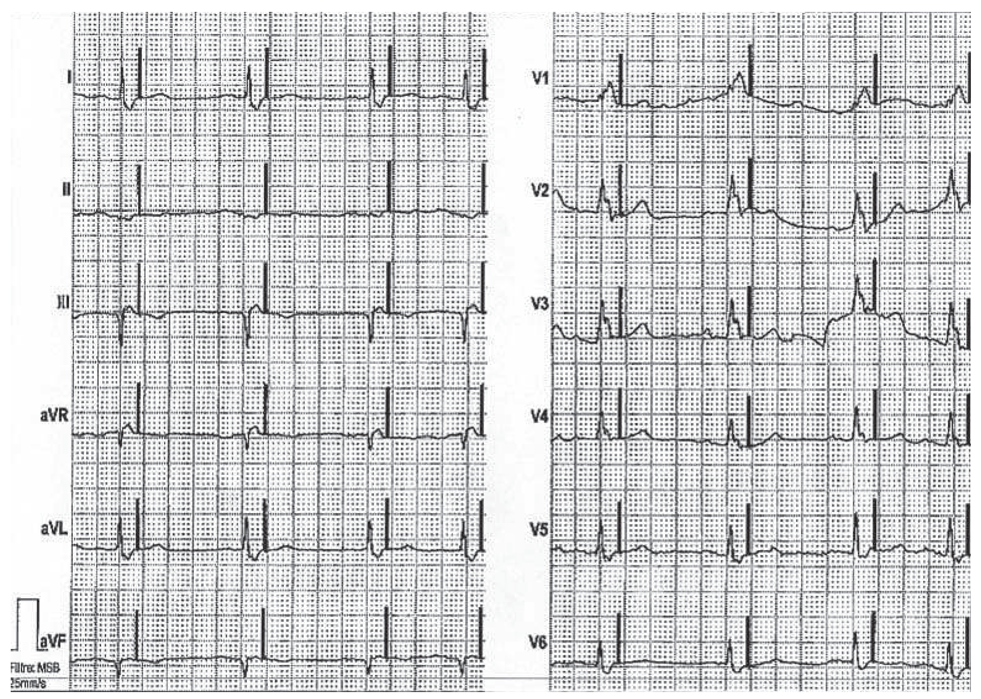 Figure 1. ECG and fax from the cardiologist. Observe a unipolar spike just after each QRS.