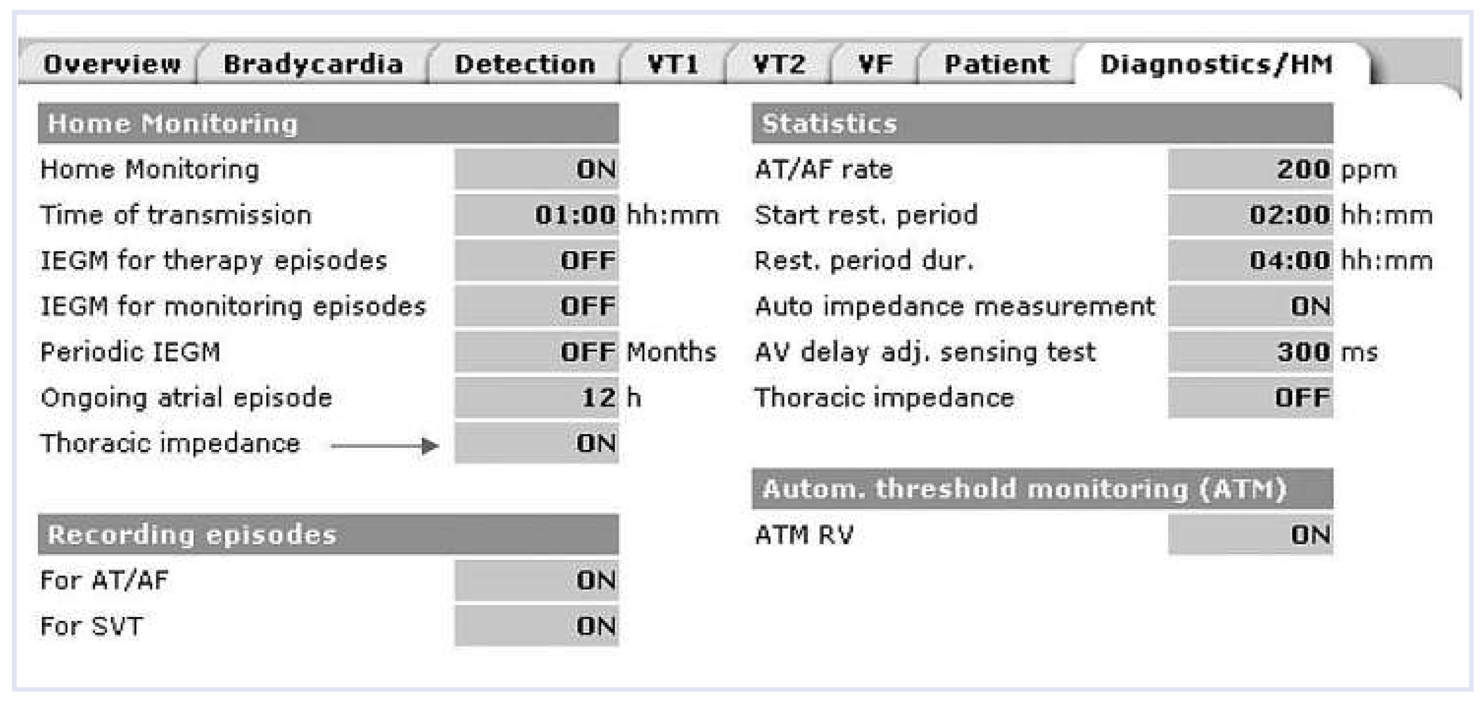 On the programmer screen, you can find this parameter in the diagnostic/home monitoring window, were by default it is programmed “on” (Figure 2). The thoracic impedance measurement [1] is based on the subthreshold pacing pulse delivered between the right ventricular coil and can (unipolar pacing). There is no negative effect for the patient because the energy of the test pulse is too small and cannot capture the heart (1 V @ 0.03 ms) and the test pulse meets refractory cells since it is coupled 100 ms after Vs or Vp. Thoracic impedance is measuremed in Biotronik devices during the first 1,096 seconds every hour.
