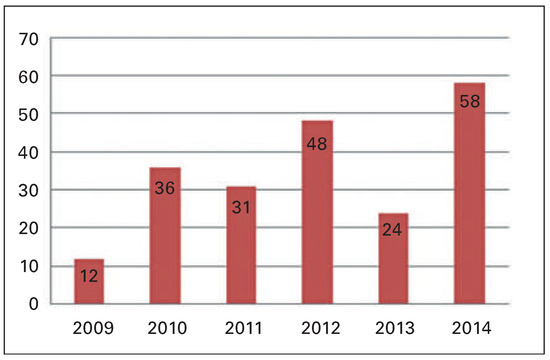 Number of MitraClip procedures performed at the University Hospital of Zurich between 2009 and 2014.