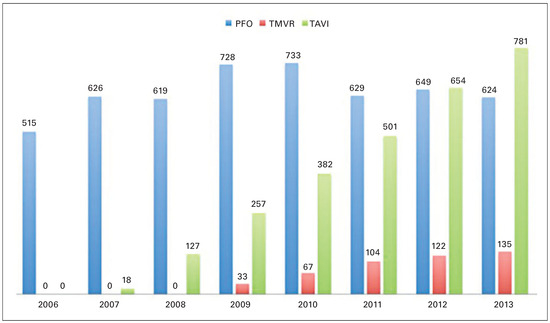 Trend in Switzerland in structural heart diseases interventions between 2006 and 2013 (PFO = patent foramen ovale; TAVI = transcatheter aortic valve implantation; TMVR = transcatheter mitral valve repair).