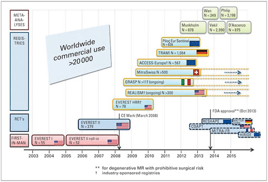 The bibliographic research was conducted using the MEDLINE (PubMed) database. Key words used for the research included: “mitraclip”, “percutaneous edge to edge”, “mitraclip registries”, “mitraclip degenerative”, “mitraclip functional”, “complications following mitraclip”, alon and in combination. Only information from full-text articles in English from international medical journals was considered. To ensure that the clinical information was as current as possible, abstracts from the most recent and important international interventional cardiology meetings were considered.