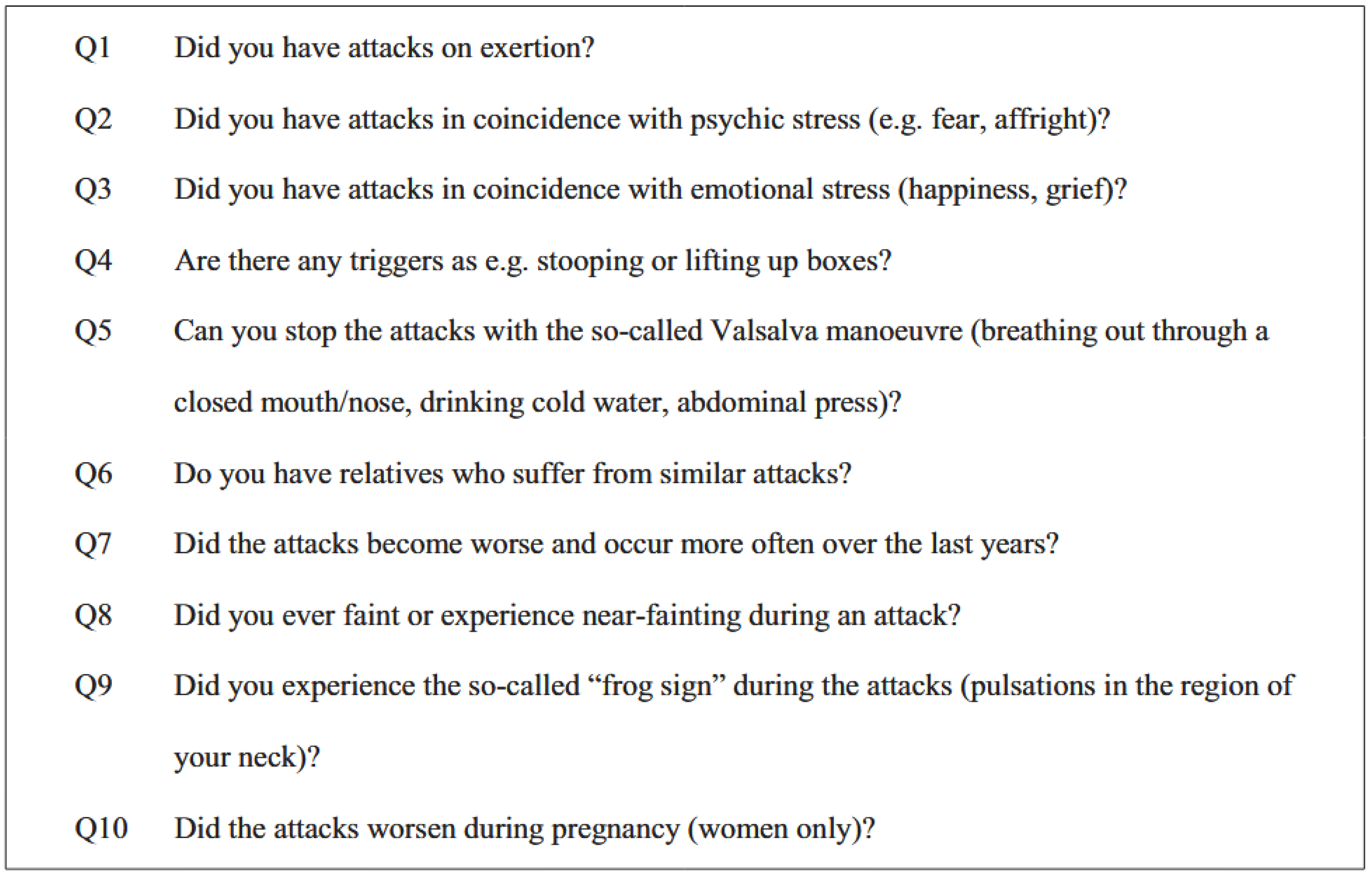In the second part, we examined whether AVNRT can be distinguished from AVRT on the basis of symptoms and the circumstances of the tachycardia. For this purpose, we used a questionnaire with 10 short questions. As there are no existing questionnaires to date, a new one was developed based on the long-standing personal experience (B.S.) in history taking in such patients. Questions related to trigger factors, relief and concomitant symptoms of the attacks, frequency of occurrence and familial clustering. The questionnaire is shown in an English translation in