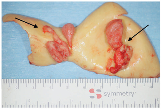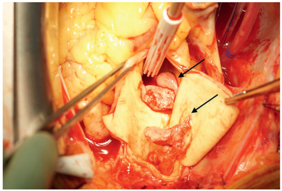 To avoid any further thromboembolic events, we decided to submit the patient to surgery and performed supracoronary ascending and hemiarch replacement in moderate hypothermic circulatory arrest; bypass grafting to the circumflex artery was not possible owing to a completely thrombosed vessel. The excised aortic segment showed three mobile rubbery structures, adherent to the aortic wall, one at the large curvature proximal to the brachiocephalic artery and two at the level of the sino-tubular junction right above the left coronary ostia (