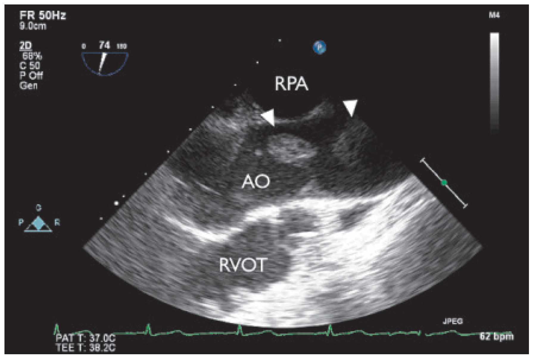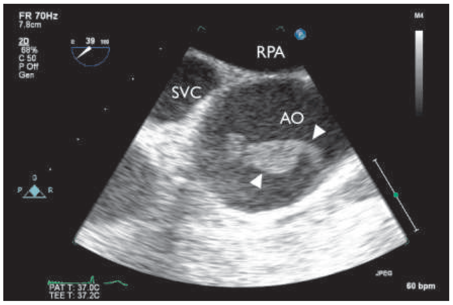 Figure 2). One insertion site to the slightly thickened anterior aortic wall was detected approximately 4 cm distal to the aortic valve. Intracardiac thrombi could be excluded.