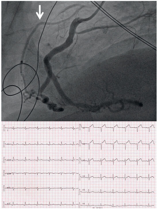 Figure 5. Top: angiogram after percutaneous coronary intervention (PCI) of the right coronary artery (RCA), LAO 90% (same angiographic projection as Figure 3, panel D). The RCA is open, and via the RCA and collaterals the LAD now becomes visible (arrow). Bottom: ECG after PCI.
