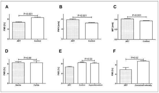 Vascular function in children conceived by means of assisted reproductive technologies (ART), control children and their parents. Flow-mediated dilation (FMD, panel A), pulse wave velocity (PWV, panel B), intima-media thickness (IMT, panel C) in children conceived by ART or conceived naturally (control). FMD in sterile and fertile parents (panel D). FMD in children conceived after ovarian hyperstimulation, ART or control (panel E). FMD in siblings, one conceived naturally and the other by ART (panel F).
