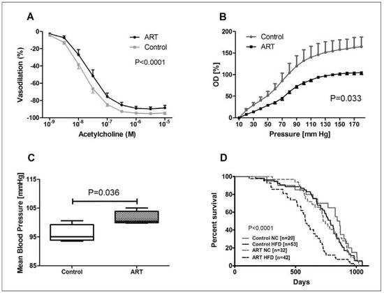 Endothelial function, arterial stiffness, arterial blood pressure and life span in mice generated with ART and control mice. Acetylcholine-induced mesenteric-artery vasodilation in vitro (panel A), carotid artery pressure diameter relationship in vitro (panel B; OD, outer diameter) and mean arterial blood pressure measured by telemetry in vivo (panel C). Kaplan-Meier survival curves of ART and control mice fed with normal chow (NC) or with a high-fat diet (HFD) (panel D).