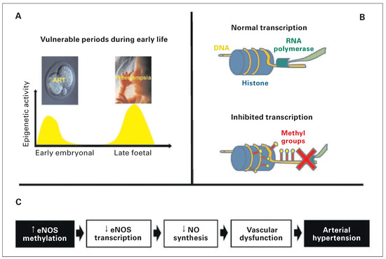 Role of epigenetic mechanisms in vascular dysfunction in mice generated with assisted reproductive technologies (ART). Vulnerable periods during pregnancy coincide with high epigenetic activity (panel A). DNA hypermethylation, one of the main epigenetic mechanism, inhibits DNA transcription (panel B). In ART mice the entire chain, starting with eNOS gene hypermethylation and ending up with vascular dysfunction and arterial hypertension (panel C). From: Rimoldi SF, Sartori C, Rexhaj E, Cerny D, Von Arx R, et al. Vascular dysfunction in children conceived by assisted reproductive technologies: underlying mechanisms and future implications. Swiss Med Wkly. 2014;144:w13973, with permission.