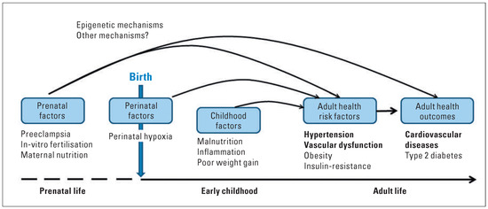 Schematic representation of prenatal, perinatal and childhood factors that may lead to epigenetic alterations that alter cardiovascular function and determine cardiovascular risk later in life.