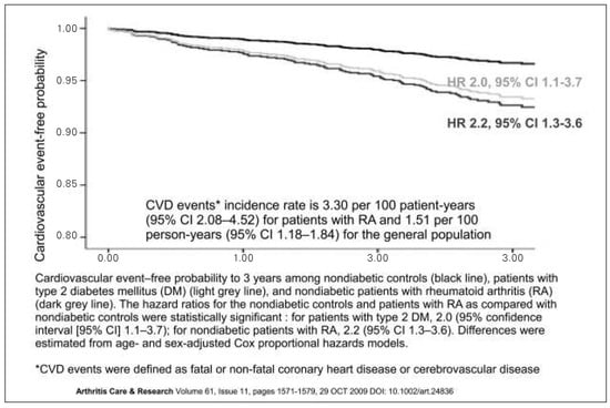 Prevalence of cardiovascular disease. The prevalence of cardiovascular disease in RA patients is comparable to patients with type 2 diabetes mellitus. From: Peters MJ, et al. Does rheumatoid arthritis equal diabetes mellitus as an independent risk factor for cardiovascular disease? A prospective study. Arthritis Rheum. 2009;61(11):1571–9. Reprinted with permission.