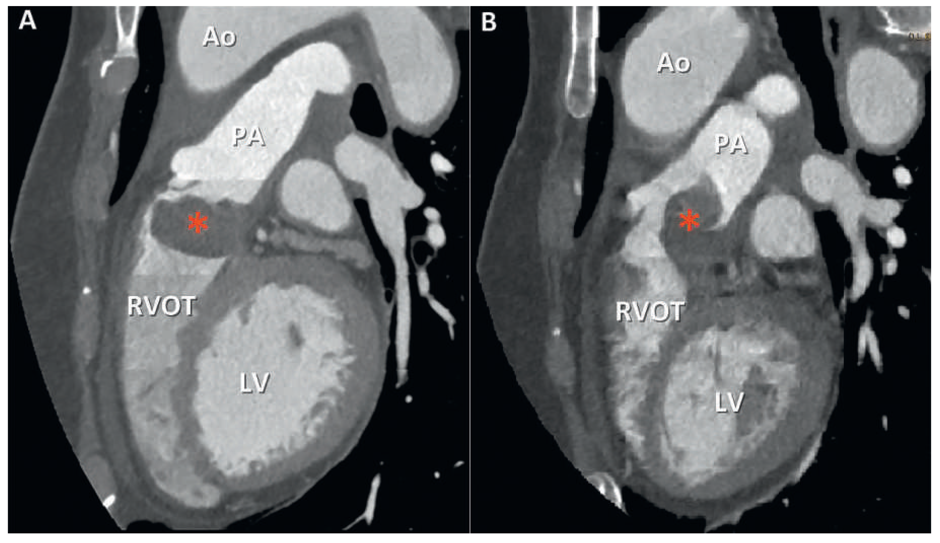 The patient was promptly referred to our institution where cardiac computed tomography (CT) revealed a 25 × 35 × 24 mm mass attached to the RVOT and extending into the pulmonary trunk through the pulmonary valve (
