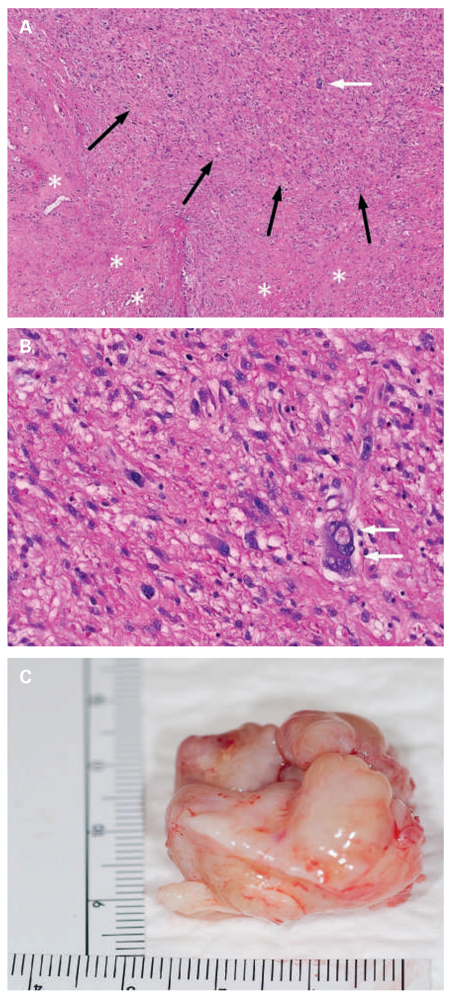 A provisory diagnosis of intracardiac malignancy was made on clinical (rapid installation of symptoms) and imaging (vascular infiltrative mass) grounds, and endovascular biopsy was attempted. The procedure was uneventful, but yielded limited material for histology. The case was discussed by a multidisciplinary panel involving cardiologists, radiologists and a cardiothoracic surgeon, and surgery was decided on. The time delay from first diagnosis on TTE to the operation was 22 days. During the procedure, a bulky, white mass, densely adherent and infiltrating the pulmonary valve and all of the pulmonary infundibulum was identified and removed, along with the deformed pulmonary valve, part of the RVOT, as well as most of the pulmonary trunk as proximally as possible to the bifurcation. An autologous graft was used to replace the valve; the right ventricle was then anastomosed to the distal part of the pulmonary artery. Postoperative histology revealed a mesenchymal tumour consisting of highly atypical spindle cells without specific differentiation (