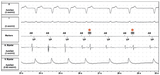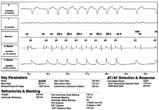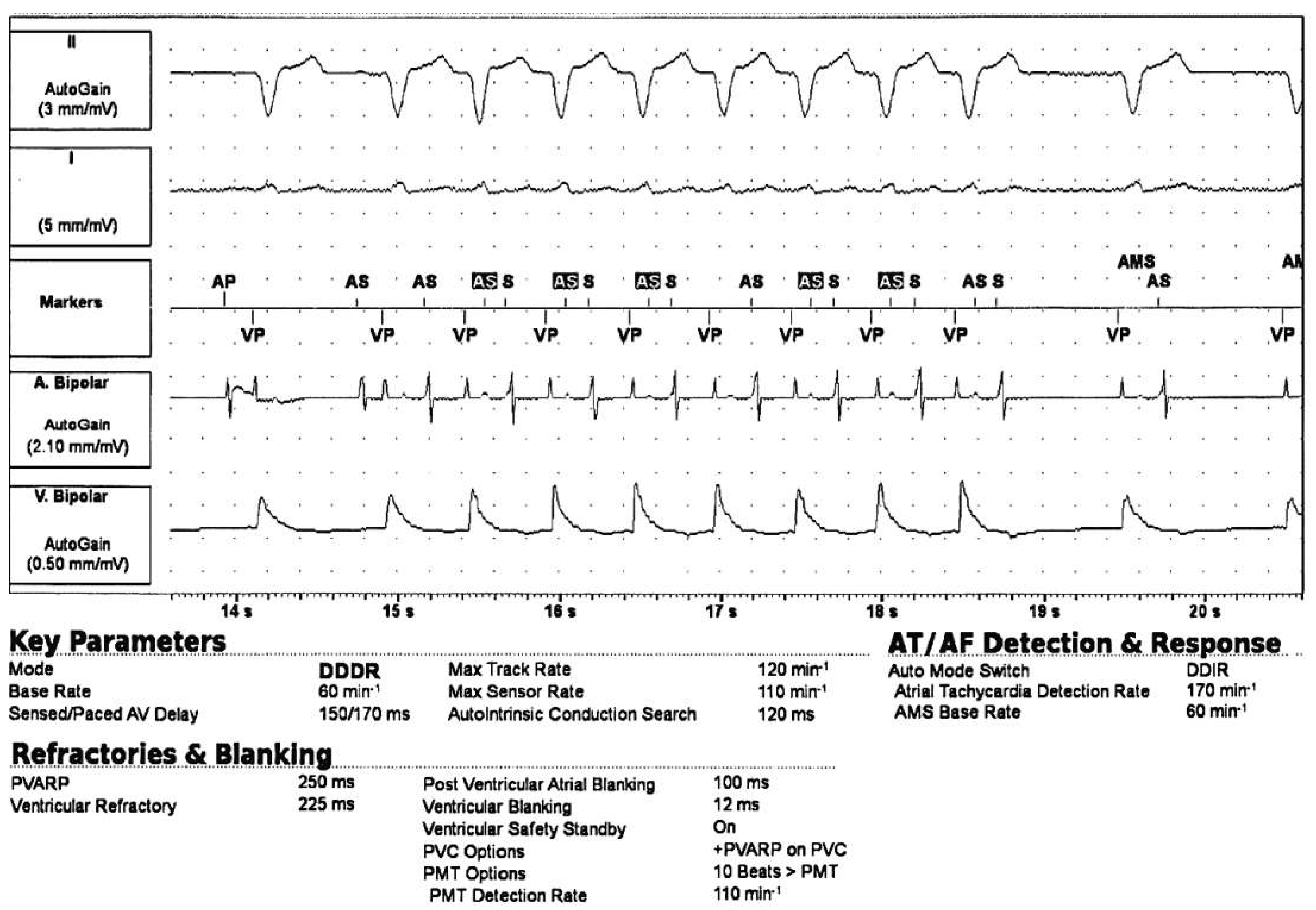 Figure 2). Alternatively, this third atrial sensed (AS) event might also be a premature atrial beat, which blocks in the AV node and allows the next VP event to conduct back to the atrium and initiate the PMT. Given that the VA time is the same for all the tachycardia beats, this possibility appeares less likely. Other precipitating factors capable of initialing a PMT could be ventricular extraystolies, loss of atrial capture, atrial oversensing followed by atrial underpacing, atrial extrasystolies, or intermittent loss of atrial sensing.