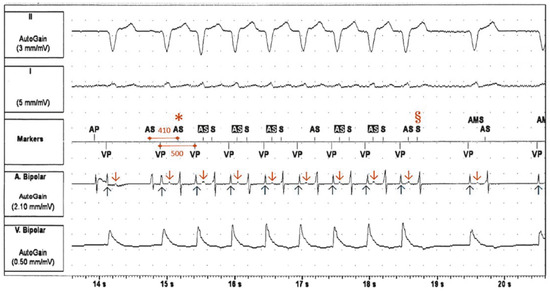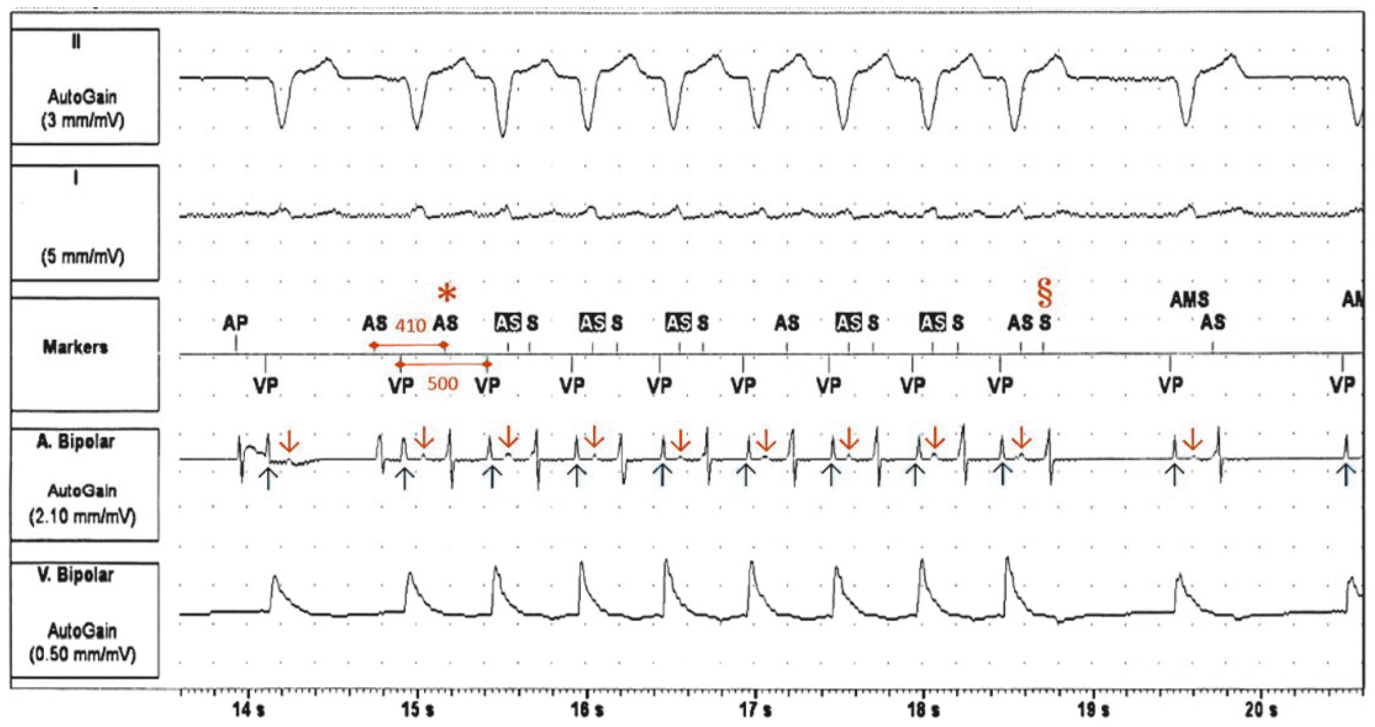 The differential diagnosis of the tachycardia at this point is an atrial tachycardia conducted to the ventricles by tracking of the pacemaker, or an endless-loop reciprocating pacemaker-mediated tachycardia (PMT) due to retrograde conduction of ventricular paced beats that are sensed in the atrium after the PVARP. The end of the tachycardia contains the solution to this: after seven beats, the tachycardia terminates with an atrial beat that is no longer tracked to the ventricle (marked § in