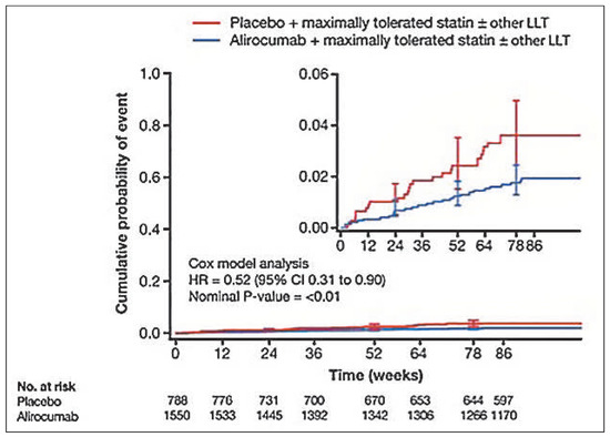 A post-hoc adjudicated cardiovascular events analysis obtained by pooling all phase III placebo-controlled trials with alirocumab (LONG TERM + HIGH FH and COMBO I + FH I + FH II) suggests a trend towards reduction in cardiovascular events (Figure 3) [35].