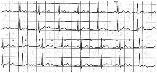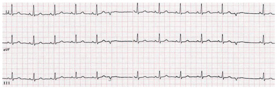 In Figure 2 the sinus rate is 150 bpm (396 ms). At first glance, complete AV block and AV dissociation might be suspected. However, there is a slight but repetitive variation in RR intervals. In a more detailed observation, a 3:2 AV block type Mobitz I can be detected with a progressive prolongation of the PR interval followed by a blocked P wave. After the dropped QRS complex, the PR interval resets and the cycle repeats. The patient remained asymptomatic without evidence of recurrent tachycardia or bradycardia during follow-up.