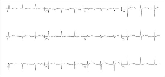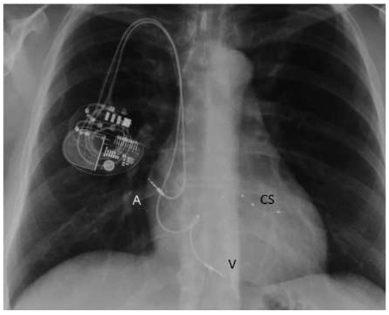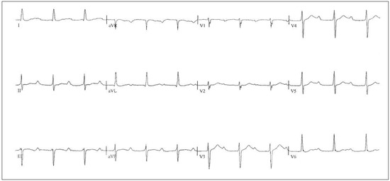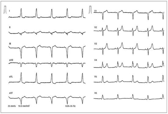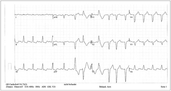 T. cruzi infection. The patient came from Central America. The patient had symptoms of arrhythmia and congestive heart failure. ECG detected a complex arrhythmia, with brady-/tachycardic episodes, Atrioventricular- and bundle-branch blocks, paroxysmal atrial fibrillation and complex supraventricular and ventricular premature beats. Echocardiography detected a dilated, hypokinetic left ventricle with moderately reduced left ventricular ejection fraction and severe diastolic dysfunction. NT-proBNP (N-terminal of the prohormone brain natriuretic peptide) was highly elevated. The patient had also symptoms of gastrointestinal Chagas disease. The diagnosis of