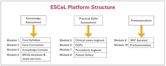 The ESCeL platform was developed with a modular structure (Figure 1) that would enable the platform to be flexible and be adapted easily to different needs, and thereby to promote harmonisation. Integrated in the three main assessment areas described in the ESC Core Curriculum (knowledge, practical skills and professionalism) there are within its structure 10 smaller basic modules.
