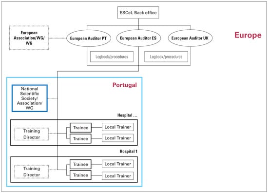 ESCeL platform workflow. Interaction between the local trainers, trainees and training directors within the training hospital with the national society, at the national level. Interaction between the trainee, European auditor, and European scientific organisation.