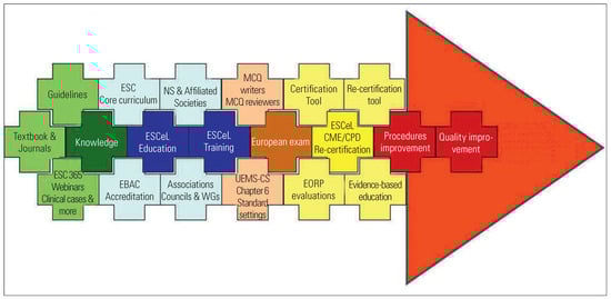 For these reasons, the European Union is paying a lot of attention to the harmonisation of medical education in Europe and to the safeguard professional standards in the field of medicine []. In order to achieve this goal, the delivery of harmonised high-standard training and education to healthcare professionals is essential. This harmonisation would facilitate the free movement of doctors across borders and would help patients have access to similar high standards of care across the different European countries. Scientific societies such as the European Society of Cardiology (ESC) are key players in the development of this harmonisation process.