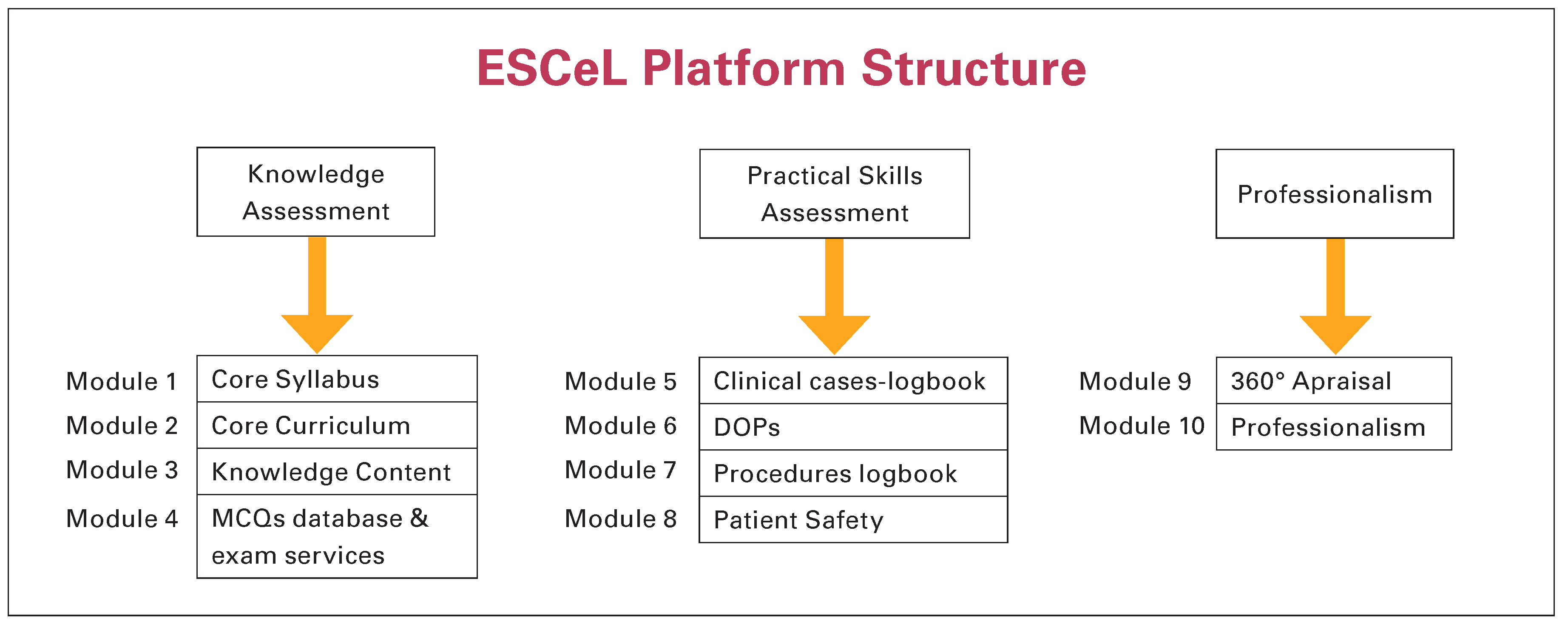 Figure 1) that would enable the platform to be flexible and be adapted easily to different needs, and thereby to promote harmonisation. Integrated in the three main assessment areas described in the ESC Core Curriculum (knowledge, practical skills and professionalism) there are within its structure 10 smaller basic modules.