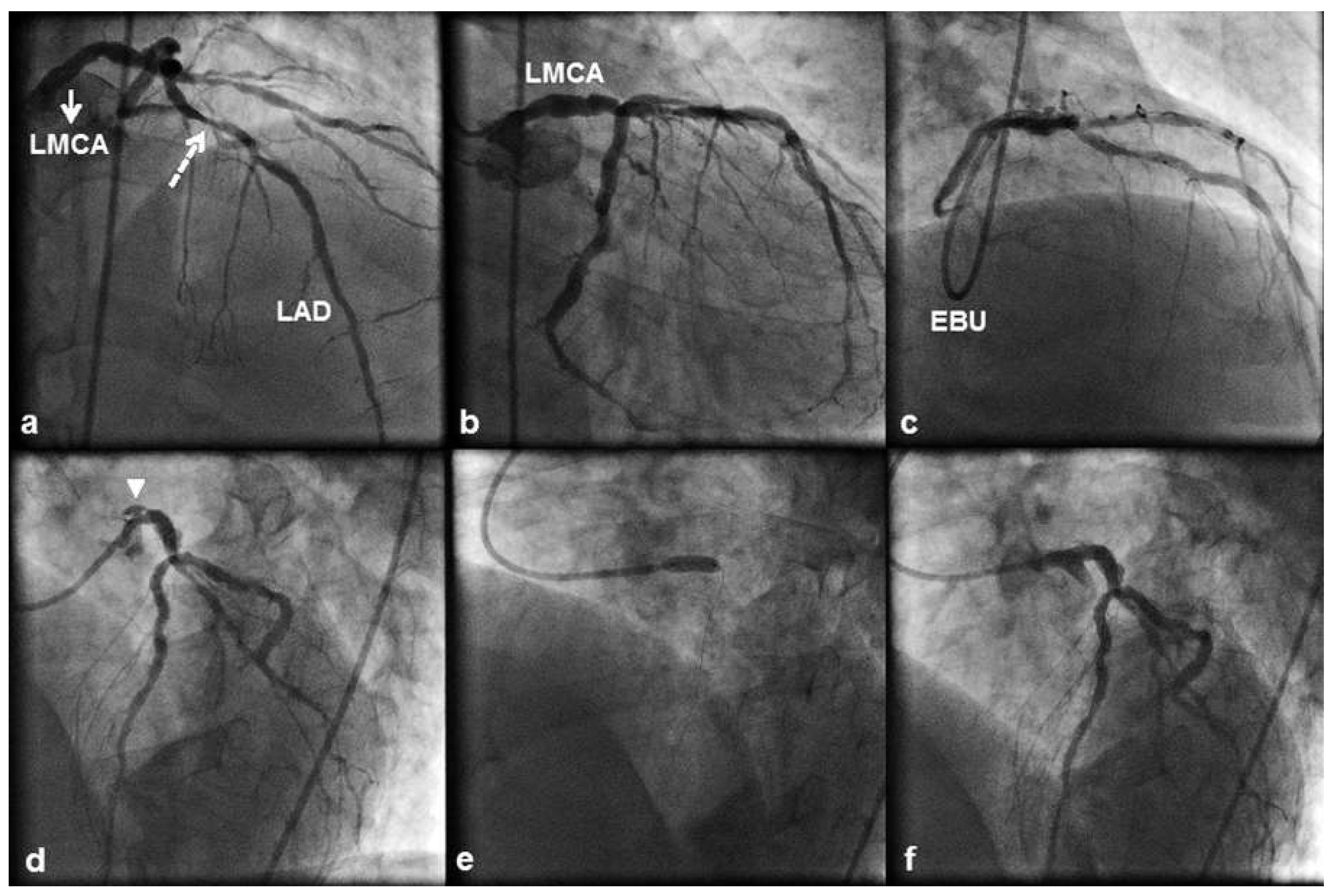 Figure 1d, the 6 French EBU 4.0 guiding catheter was non coaxially positioned with its tip pointing vertically against the roof of the LMCA. Accordingly, a hydraulic LMCA dissection might have been created during contrast injection. Keeping the catheter coaxially positioned during every minute of the procedure, avoiding contrast media injection in the presence of pressure damping or ventricularisation and gradual ramping of the injection are essential actions in order to minimise the risk of LMCA dissection.