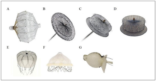 Devices used for LAA Occlusion. (A) Plaato, 2001. (B) Amplatzer non-dedicated device, 2002. (C) Amplatzer Cardiac Plug (ACP), 2008. (D) Amplatzer Amulet, 2013. (E) Watchman, 2002. (F) Wave Crest, 2011. (G) LAA Transcatheter Patch, 2008.