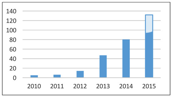 Number of LAAOs performed each year. In 2015, 132 LAAOs were performed of which only 95 were included in the study.