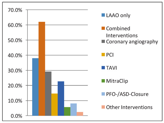 LAAO was either a stand-alone procedure or was combined with selective coronary angiography, percutaneous coronary intervention (PCI), transcatheter aortic valve implantation (TAVI), MitraClip implantation, PFO/ASD closure or other interventions.