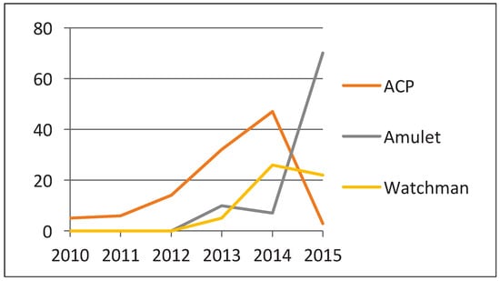 In almost half of the patients (43.3% or 107 patients), ACP devices were used, whereas the Amplatzer Amulet was used in 35.2% (87 patients) and the Watchman Occluders in 21.5% (53 patients) (Figure 5). The numbers of different devices implanted are listed in Table 2.