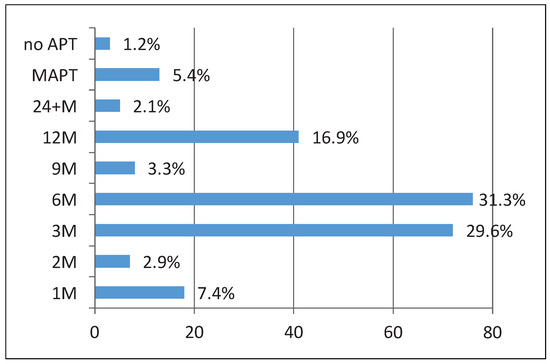 Postprocedural anticoagulation regimens. Dual antiplatelet therapy was given from 1 month (1M) to lifelong (24+ M). In a few patients no antiplatelet therapy (no APT) or only single antiplatelet therapy (MAPT) was prescribed.