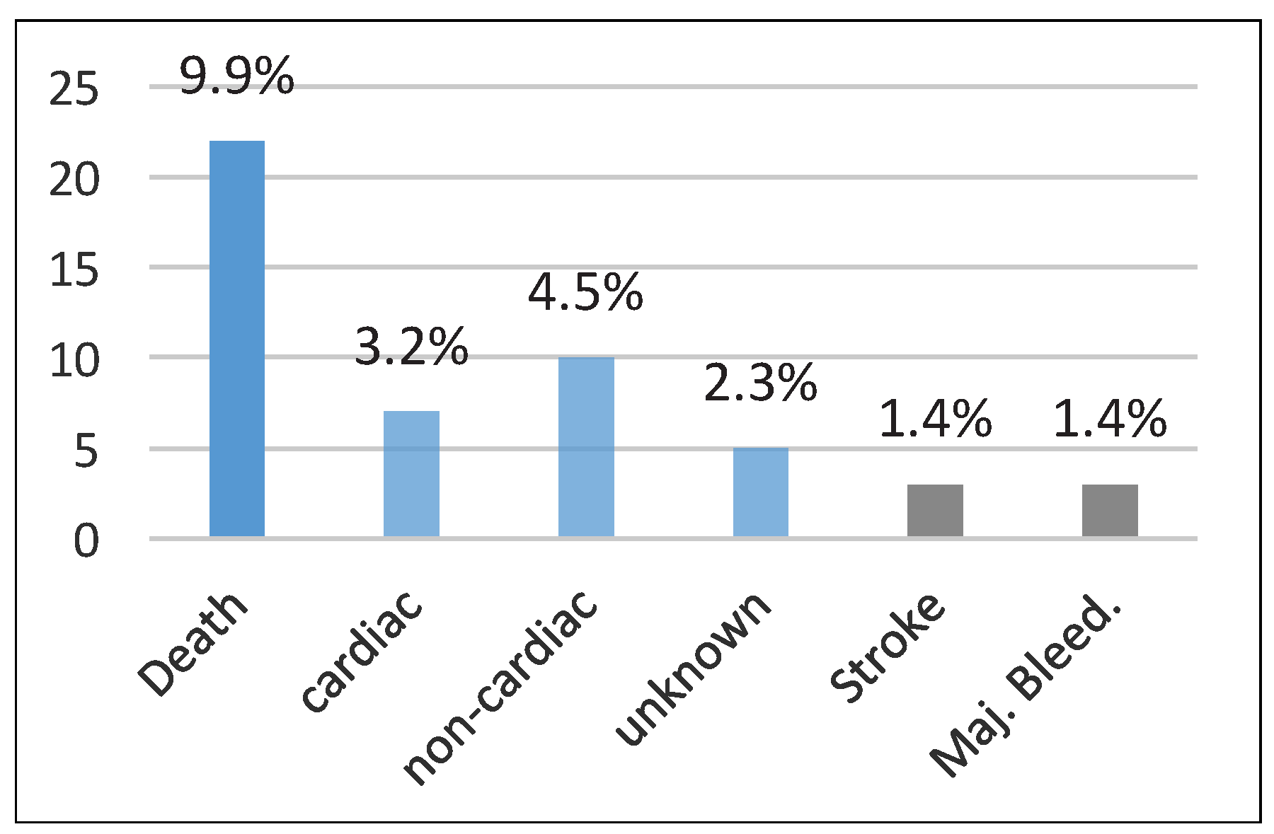 Clinical follow-up data included deaths (cardiovascular, other or unknown), cerebrovascular accidents and major bleeding events.