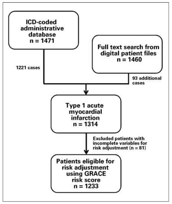 Methods: In 1471 consecutive patients admitted with AMI to a Swiss university hospital in 2012 and 2013, we quantified working hours needed by a trained healthcare professional to complement the available administrative dataset by detailed medical review of all available medical records to: 1) differentiate the subtypes of AMI in order to separate type 1 (including type 4) AMIs from type 2 and postoperative AMIs (GRACE is only validated for type 1 AMI); 2) add all medical variables required to calculate the GRACE score.