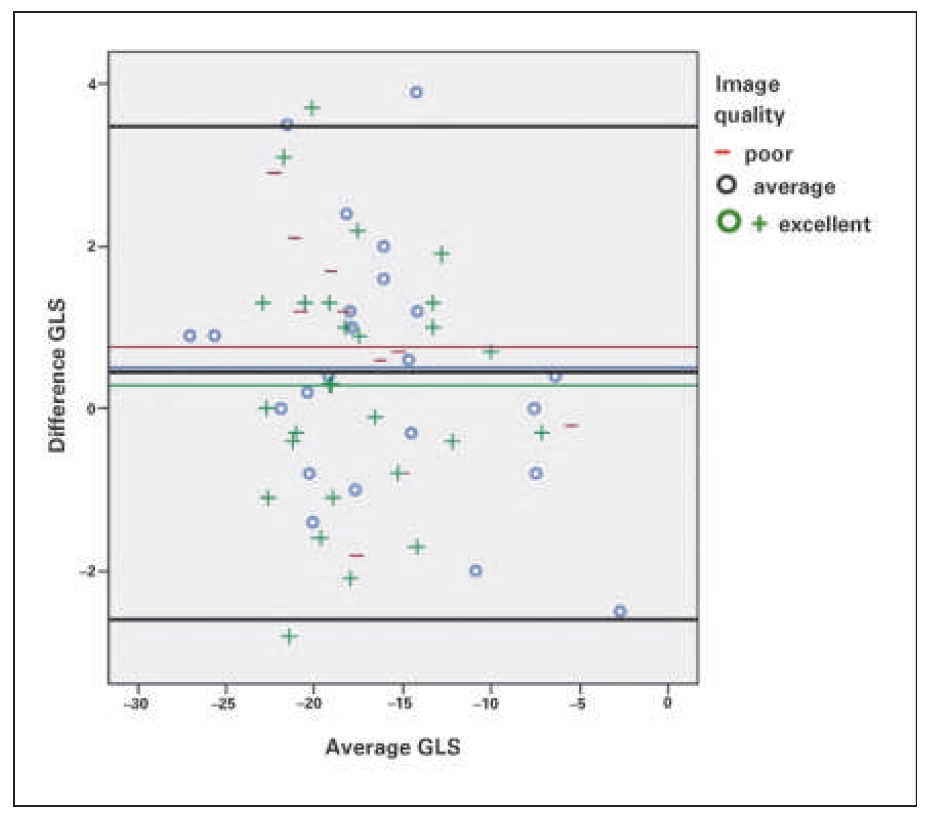 Table 2. Echocardiographic image quality had a significant impact on GLS: in patients with excellent image quality GLS was 18.9 ± 3.2% versus 16.4 ± 4.5% in those with poor image quality; p = 0.006. A higher BMI had an impact on image quality. In