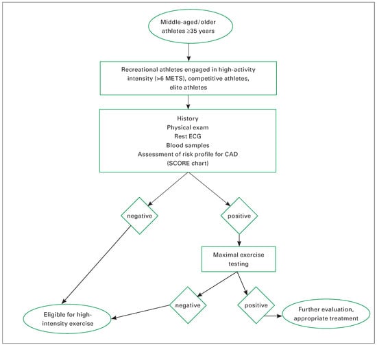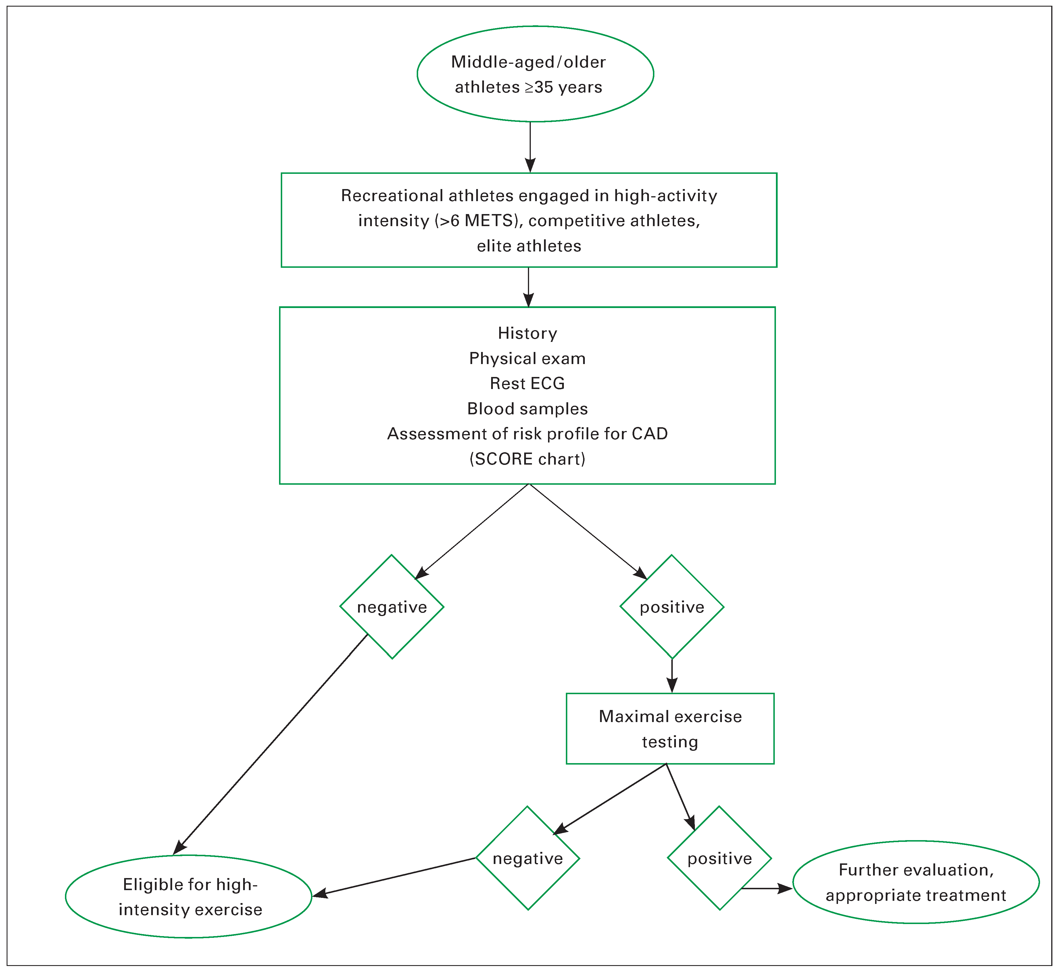 - Preparticipation screening in middle-aged / older athletes aged ≥35 years, recreational athletes engaged in high-activity intensity (>6 METS), competitive athletes, elite athletes (Figure 2):