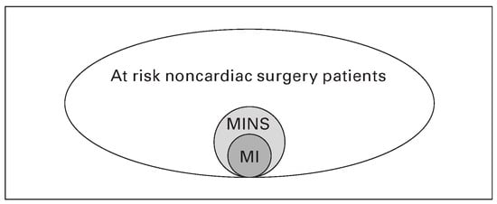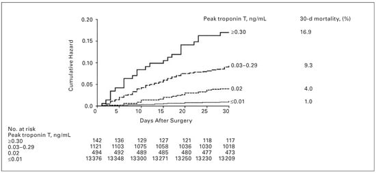 - Vascular Events In Noncardiac Surgery Patients Cohort Evaluation (VISION) Study Investigators, Devereaux PJ, Chan MT, Alonso-Coello P, Walsh M, Berwanger O.; et al. Association between postoperative troponin levels and 30-day mortality among patients undergoing noncardiac surgery. JAMA. 2012, 307, 2295–2304. [Google Scholar] [CrossRef] [PubMed]