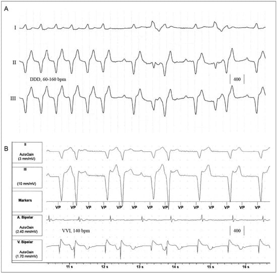 Tracing (A): ECG at exercise stress test with sudden onset of a 2:1 block and occasional appearance of late coupled beats with a different QRS morphology (most likely delayed afterdepolarisations) at a heart rate of 135 bpm. Tracing (B): Pacing in VVI mode (maximum output of 7.5 volts and maximum pulse width of 1.5 milliseconds) with loss of 1:1 ventricular capture and onset of first 3:2 followed by 2:1 ventricular capture at heart rate of 140 bpm.