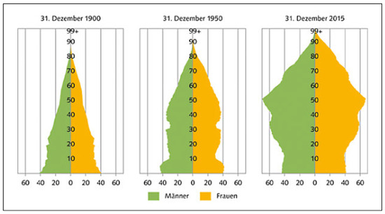 Alterverteilung der Schweiz über die Zeit: Anzahl Personen in Tausend (Quelle: Bundesamt für Statistik, Neuchatel, 2016).