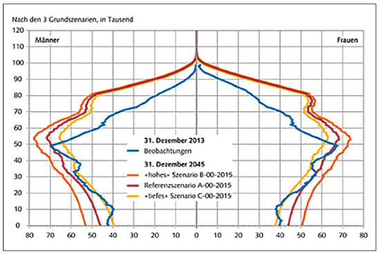 Zukünftige Alterspyramide (in Tausend) nach drei Grundszenarien für die Schweiz. (Quelle: Bundesamt für Statistik, 2015).