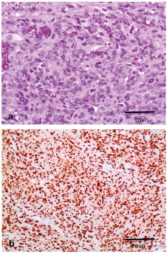 (a) Solid tumour with atypical epithelioid and spindle cells and (b) erythroblast transformation specific related gene (ERG) immunohistochemical staining showed diffuse nuclear positivity.