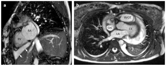 Cardiac magnetic resonance (CMR) cine images (steady state free precession) in an axial (a) and in a short axis (b) view of the residual tumor after first resection. The mass (**) can be recognised on the back of the right atrial appendage, at the entrance of the superior vena cava. The images also show presence of pericardial effusion (arrows). LA: left atrium; RA: right atrium; RV: right ventricle; RVOT: right ventricular outflow tract; SVC: superior vena cava.